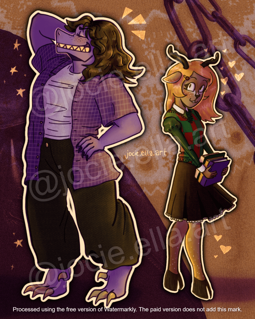 I wanted to draw the cutest ship in Deltarune so far–Susie and Noelle. I used a Christmas sweater texture as well as a leather jacket texture for the background to make a fun collage background that represents them both.
