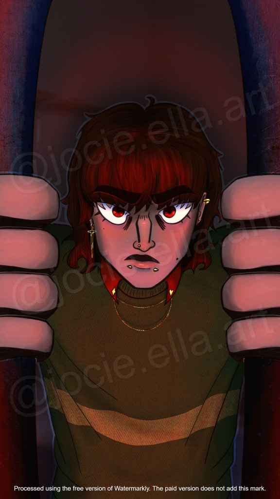 Every night, Kris rips out the soul and locks it in their birdcage out of fury and terror. This piece comes from thinking about how Kris would probably glare at us at different times during the night. The deconstruction of “protagonist-ism” as well as the hidden analog horror within Deltarune is fascinating and I find myself drawn to creating artworks with those ideas in mind.